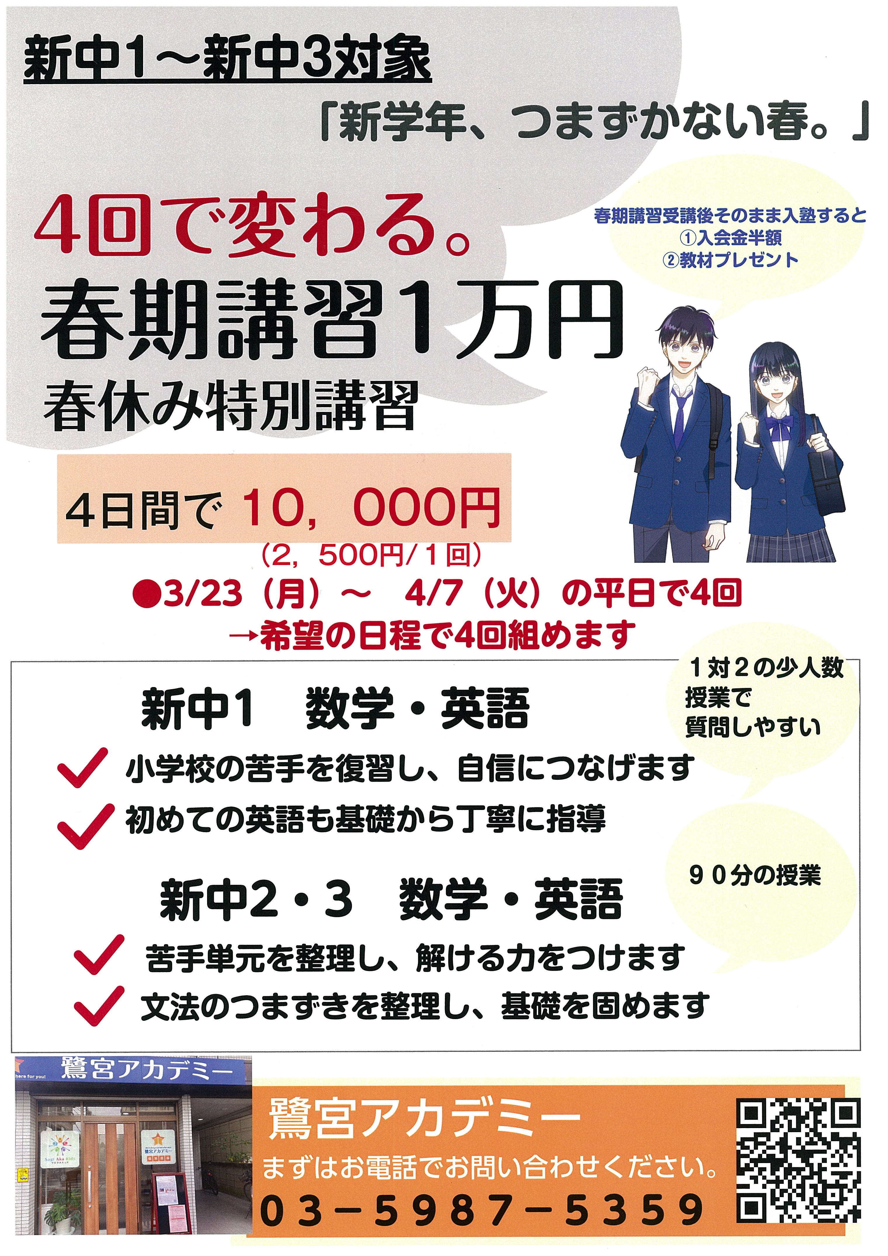 新中1~新中3を対象に4日間で1万円の春期講習を実施します。